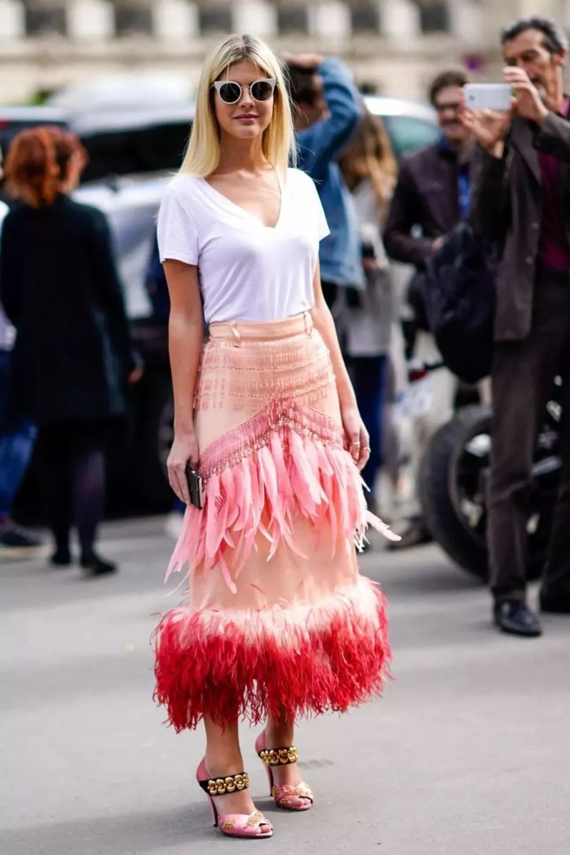 เพิ่มความโดดเด่นแต่ก็ดูเป็นอีกลุคที่สามารถใส่ได้ everyday เพราะเป็นไอเทมที่น้อยแต่มาก ๆ ค่ะ ก็แหมกระโปรงที่เราเลือกมาเนี่ยดูสะดุดตาเก๋เป็นที่สุด ทั้งลูกเล่นขนนก ลายปักดอกไม้ และกระโปรงที่มีพู่ระบายย้อย ๆ แบบ Fringe style นั่นเองจ้าาา