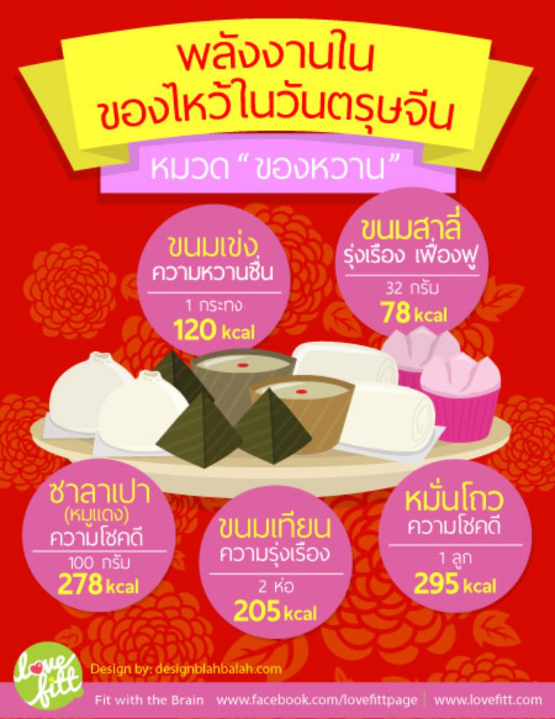 สุดท้ายกับหมวดของไหว้ที่สาว ๆ เป็นต้องกลัว เพราะเป็นของหวานนั่นเอง ซึ่งของหวานที่ใช้ไหว้เจ้าก็มีหลากหลายชนิด ซึ่งพลังงานแต่ละชนิดก็ไม่ใช่น้อยเลย เช่น ซาลาเปาหมูแดงเพียง 100 กรัม ให้พลังงานถึง 278 kcalเลยนะคะ ฉะนั้นกินอะไรก็ระวังจะน้ำหนักขึ้นไม่รู้ตัวล่ะค่ะ
