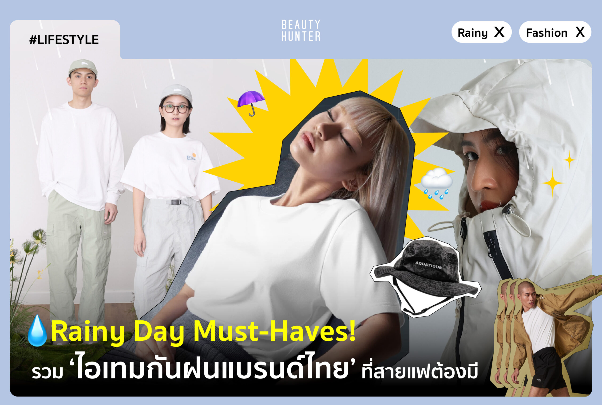 หน้าฝนกับผมชี้ฟูคือของคู่กัน แต่ไม่ใช่ปัญหาสำหรับคนมีหมวกกันฝนจ้าา~ ใครที่หน้าฝนทีไรผมชี้ฟูไม่เป็นทรง ต้องมีนะคะ หมวกของแบรนด์ ‘Aquatique’ หมวกเค้าดีไซน์ออกมาให้กันฝน กันน้ำได้จริง แต่ยังคงความคิวท์แบบมีสไตล์ อินสไปร์จากกิจกรรมเอาท์ดอร์ และโลกของท้องทะเล แล้วสีกับรูปทรงเขามีให้เลือกเยอะมาก แนะนำให้เลือกสีจี๊ดมาแมทช์ในวันฝนตกนะ ช่วยให้ฟีลเราไม่หม่นตามอากาศได้ด้วย แถมใส่แล้วไม่ใช่แค่กันเปียกแต่ยังช่วยทำให้ลุคดูชิคขึ้นทันตาเห็น จะแค่เดินตากฝนไป BTS ก็รอดหมด แถมยังถ่ายรูปออกมาเก๋ด้วย