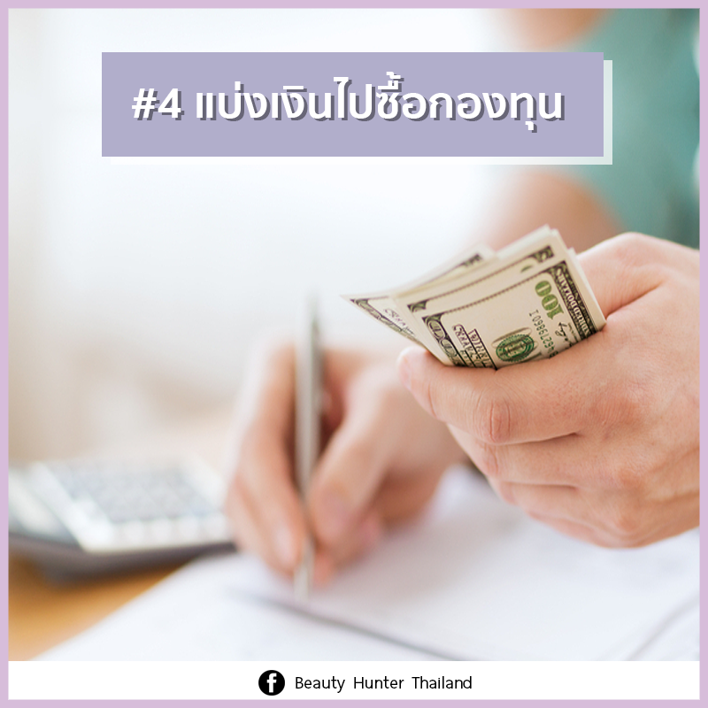 แบ่งเงินไปซื้อกองทุน: “เงินเก็บไว้ ไม่ใช้ก็ไม่เน่า” อันนี้ถูกค่ะ แต่ถ้ามีช่องทางไหนที่จะทำให้เงินก้อนหนึ่งของเรางอกเงยขึ้นมาได้ก็ควรทำนะคะ อาจจะคิดลงทุน ร่วมหุ้นเปิดธุรกิจ หรือถ้าไม่อยากมีธุรกิจเป็นของตัวเองก็แนะนำให้ไปซื้อกองทุนไว้เลยค่ะ แต่ก่อนที่จะไปซื้อกองทุนคุณต้องแน่ใจก่อนนะคะ ว่ามีเงินเก็บมากพอที่จะสำรองเอาไว้ใช้ยามฉุกเฉินได้ ทั้งนี้ทั้งนั้น เรื่องการลงทุนก็ต้องศึกษาให้ดีๆ นะคะ