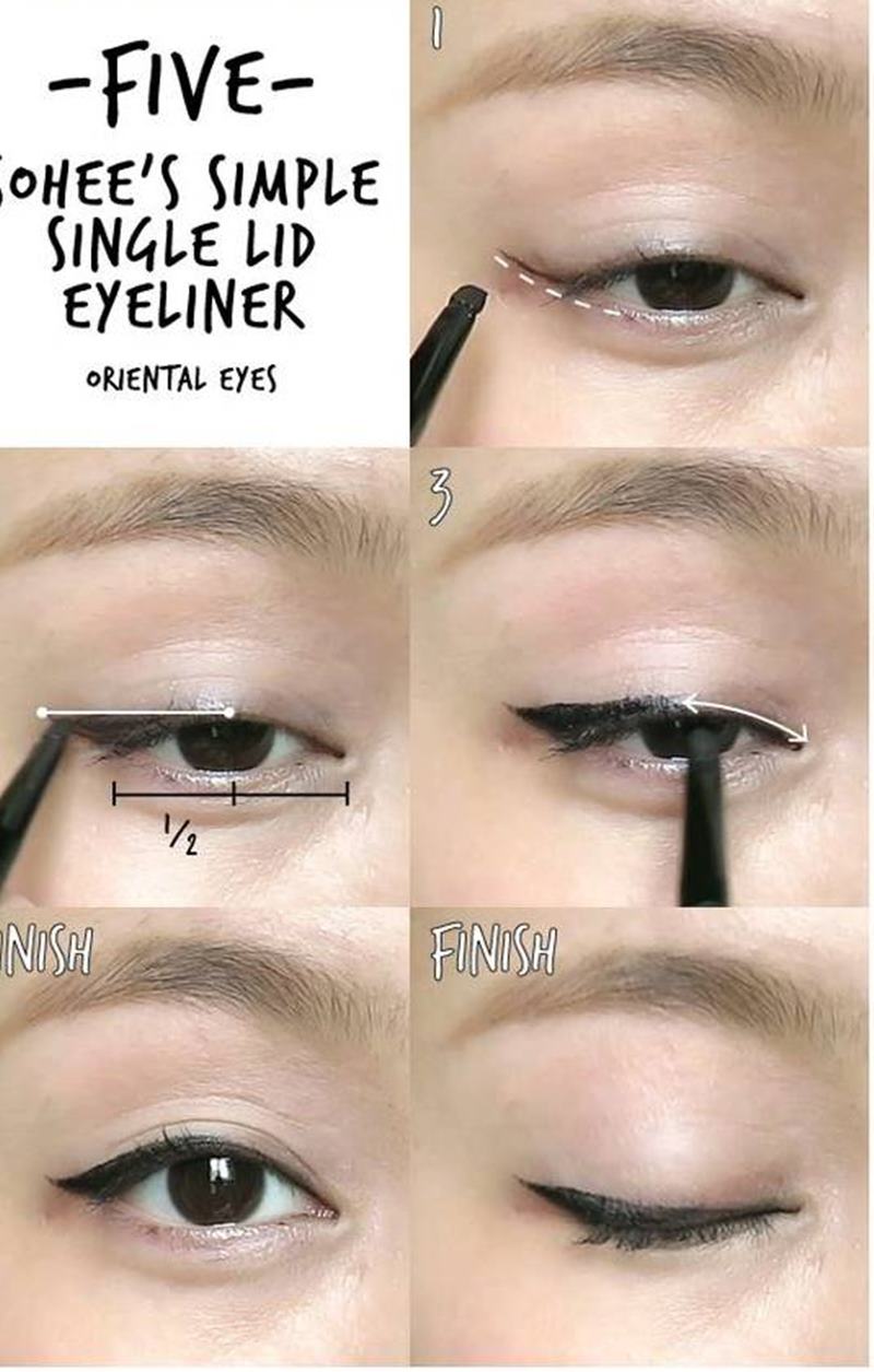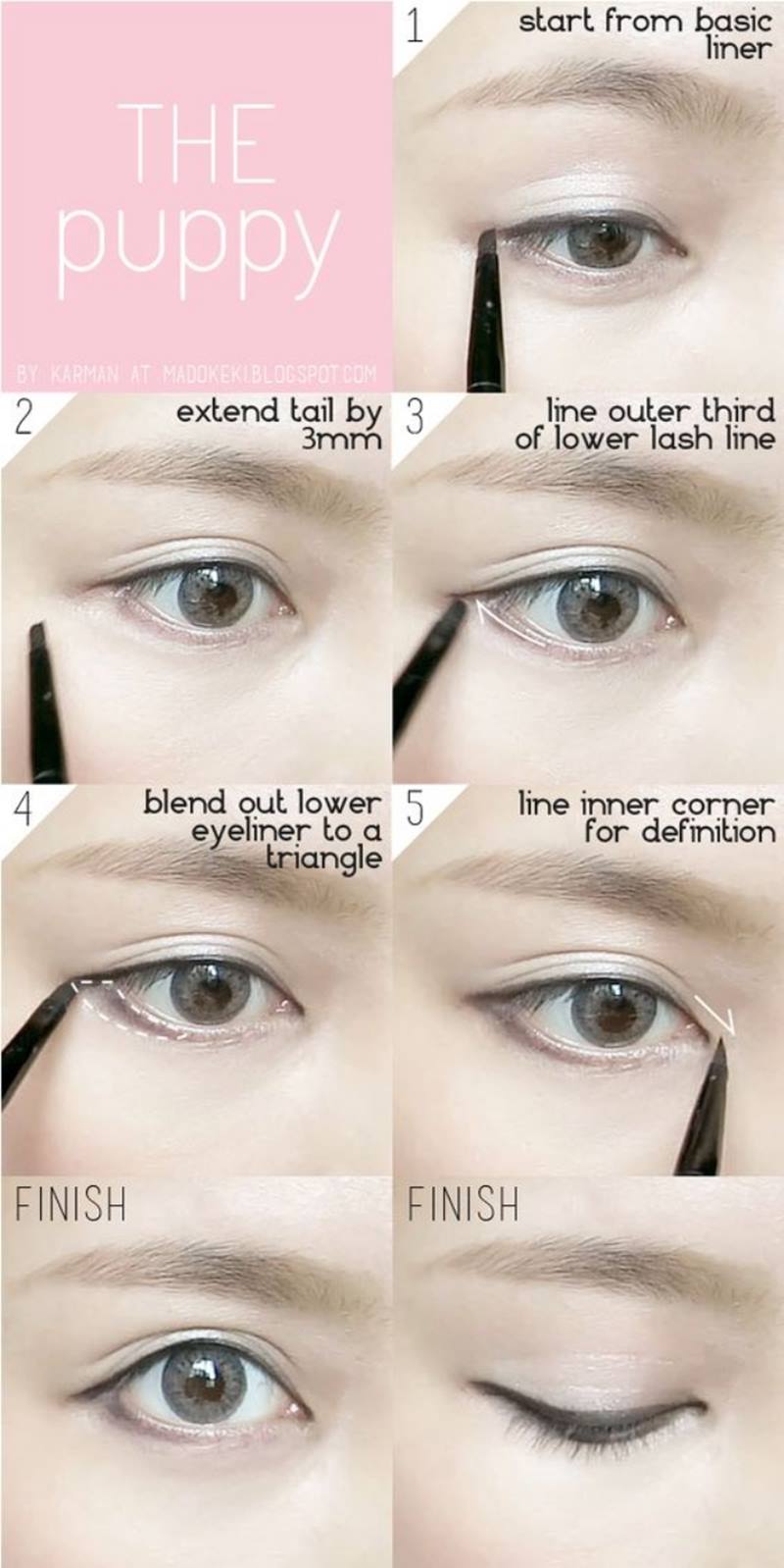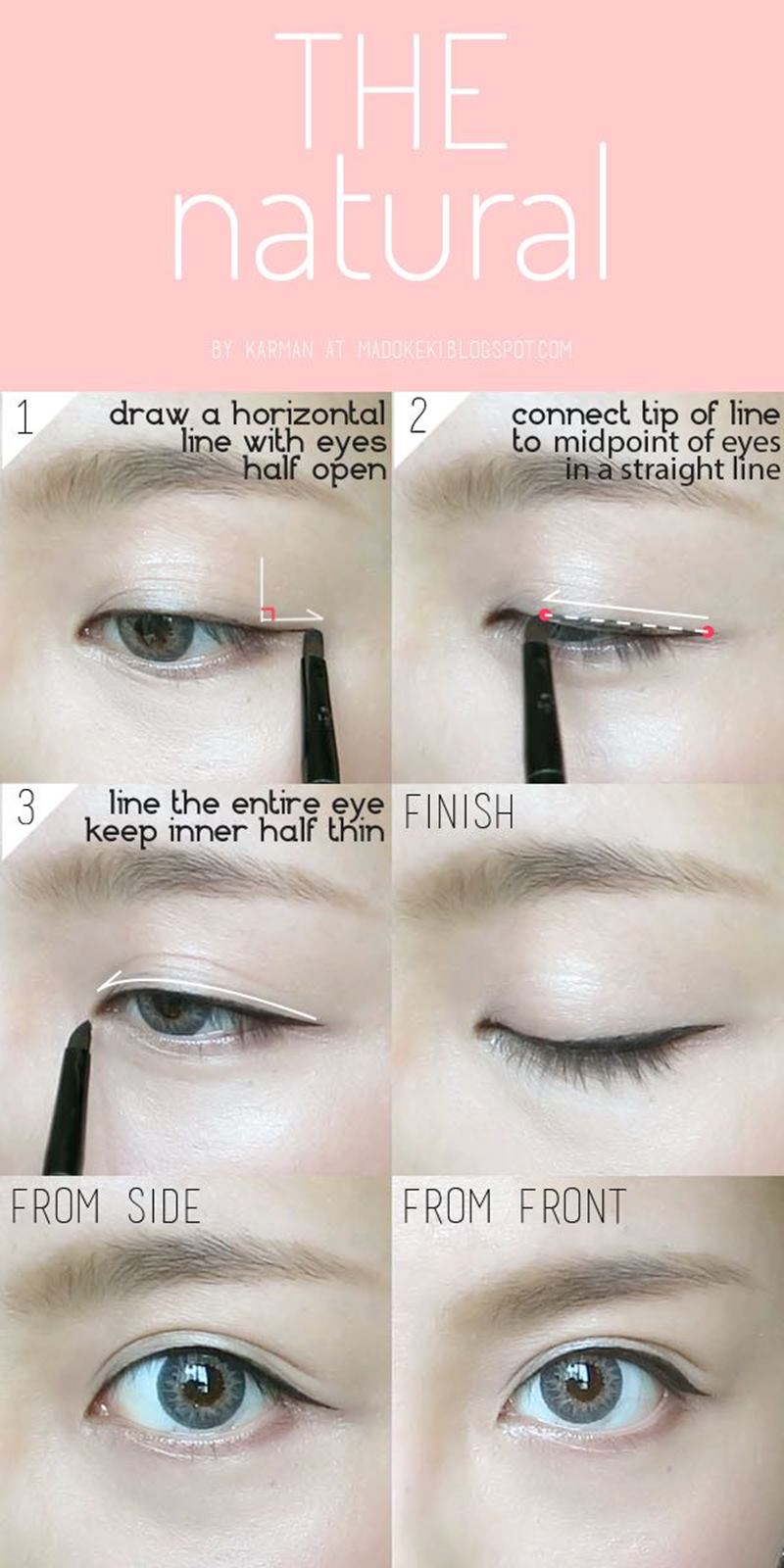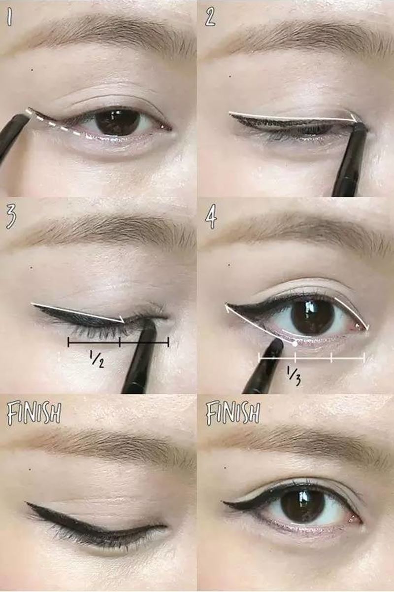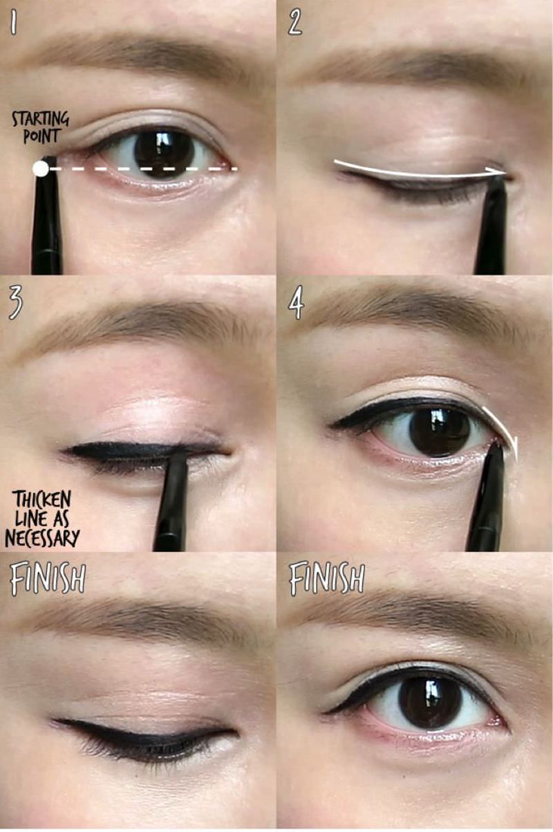 - เขียนเส้นอายไลเนอร์บางๆ ตามรูปตาโดยเขียนบริเวณหางตาให้ตกลงมาไม่วิงหางขึ้น
