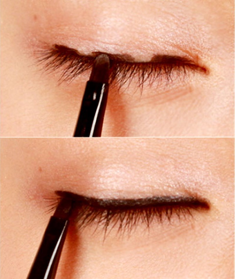 - ใช้อายไลเนอร์แบบเจลเขียนเข้าไปบริเวณโคนขนตาด้านบน